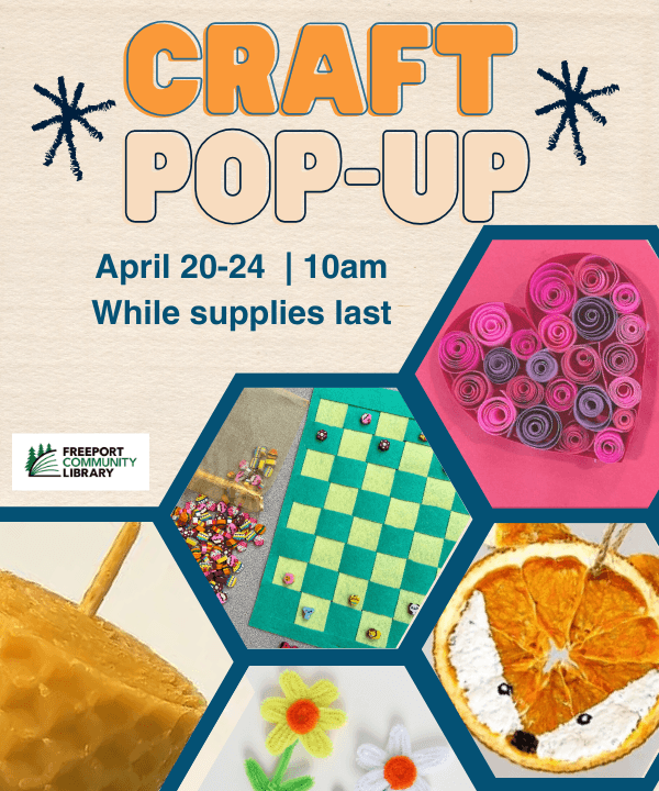 Freeport Community Library 10 Library Dr, Freeport, ME, United StatesHave a crafty April break and visit the library for a daily pop-up activity. The library will provide everything you need to make each day’s self-led craft.